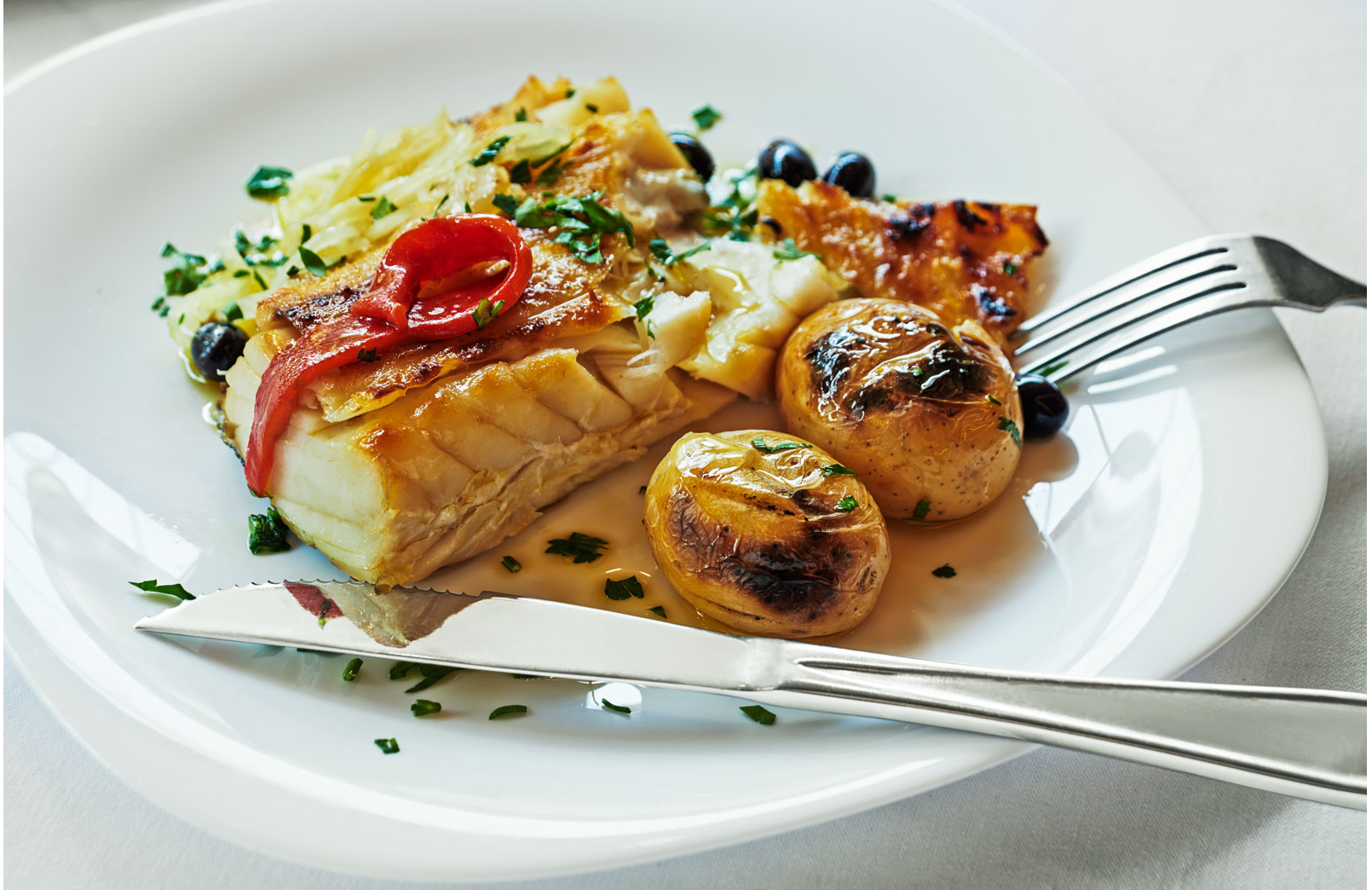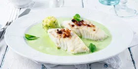 Perfekt stekt skrei-loin: Stek i teflonpanne på 70% varme i 3 min. Tilsett hvitvin, aromater. La hvile under lokk i 5 min. Sjekk kjernetemperatur.